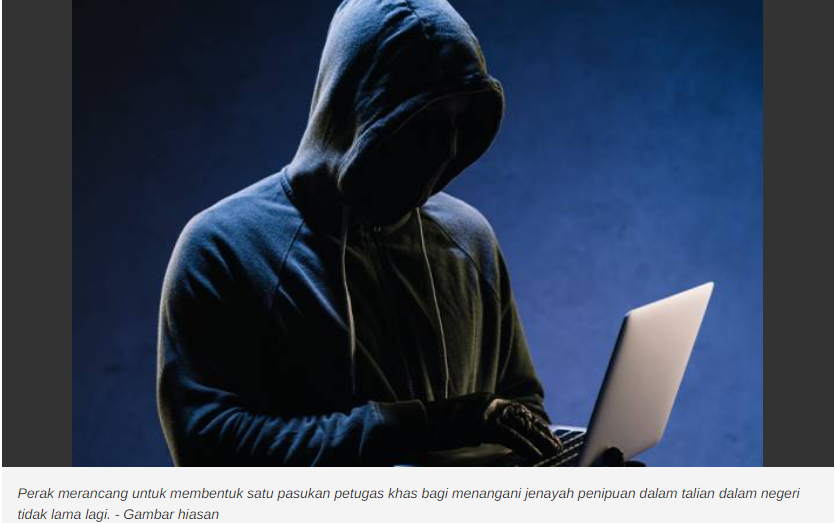 KAMPAR: Perak merancang untuk membentuk satu pasukan petugas khas bagi menangani jenayah penipuan dalam talian dalam negeri tidak lama lagi.