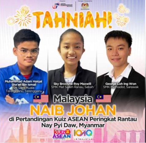 Jabatan Penerangan dalam kenyataan memaklumkan tiga peserta itu ialah Sky Broxlyne Roy Maxwill dari Sekolah Menengah Kebangsaan (SMK) Mat Salleh Ranau, Sabah; George Loh Ing Won dari SMK Methodist, Sarawak dan Muhammad Adam Haiqal Shaari Ismail dari Sekolah Menengah Sains Kuala Terengganu, Terengganu.