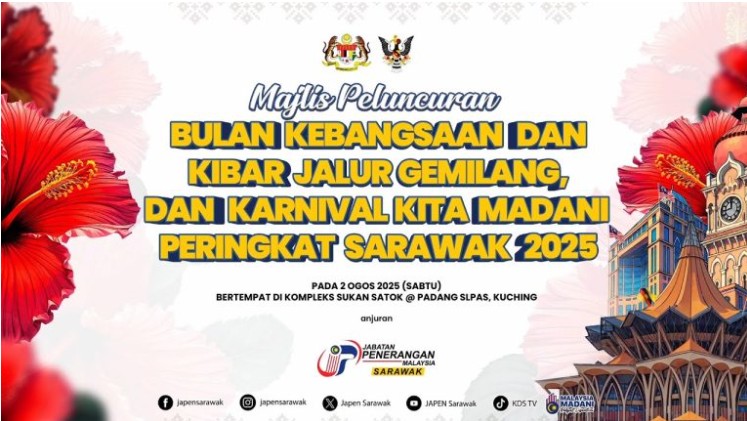 KUCHING: Majlis Peluncuran Bulan Kebangsaan dan Kibar Jalur Gemilang Peringkat Sarawak 2025 akan berlangsung pada 2 Ogos di Kompleks Sukan Satok di sini, dengan mengetengahkan pelbagai aktiviti selari dengan tema Hari Kebangsaan dan Hari Malaysia (HKHM) 2025, ‘Malaysia MADANI: Rakyat Disantuni’.