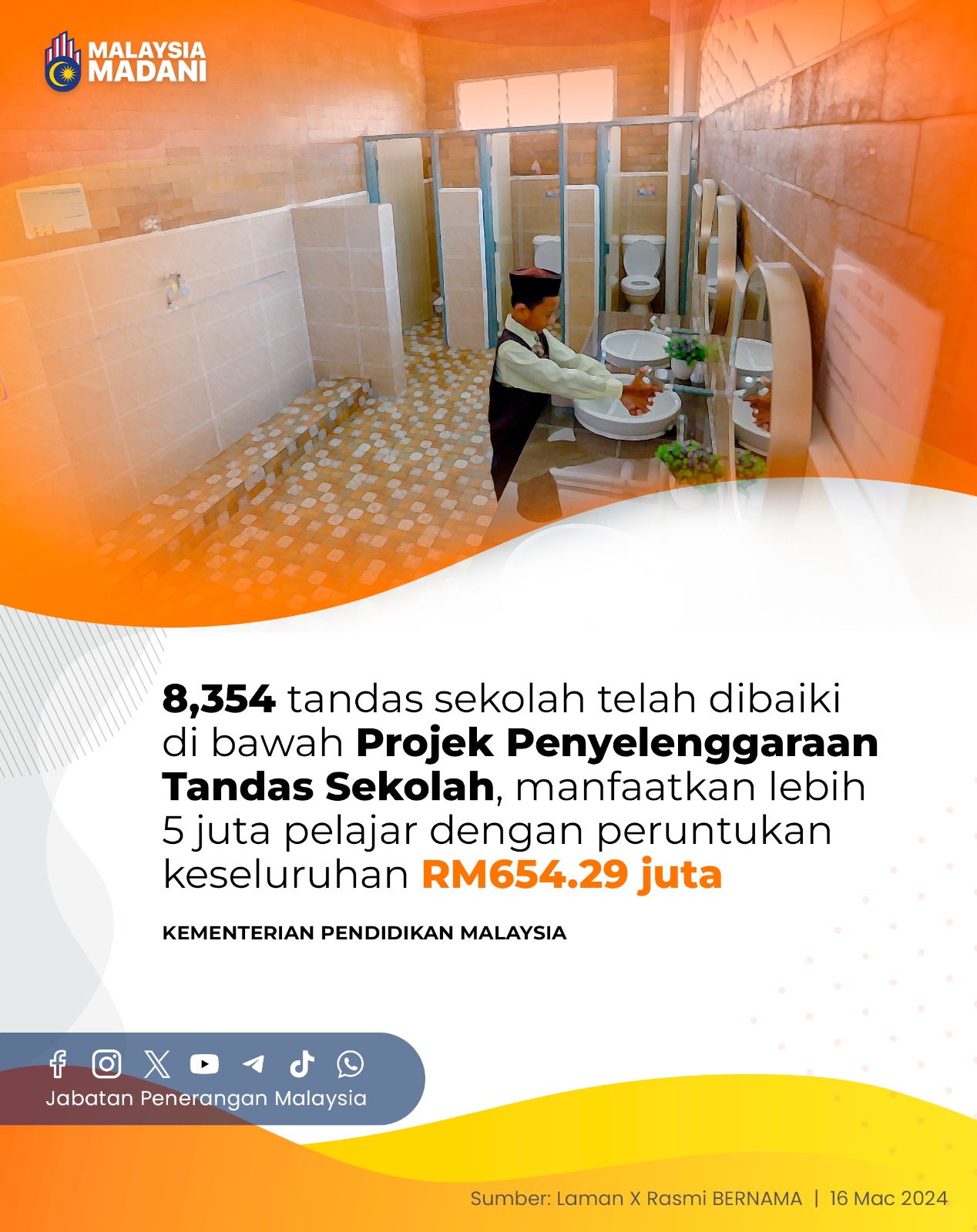 8,354 TANDAS SEKOLAH TELAH DIBAIKI DI BAWAH PROJEK PENYELENGGARAAN TANDAS SEKOLAH, MANFAATKAN LEBIH 5 JUTA PELAJAR DENGAN PERUNTUKAN KESELURUHAN RM654.29 JUTA
