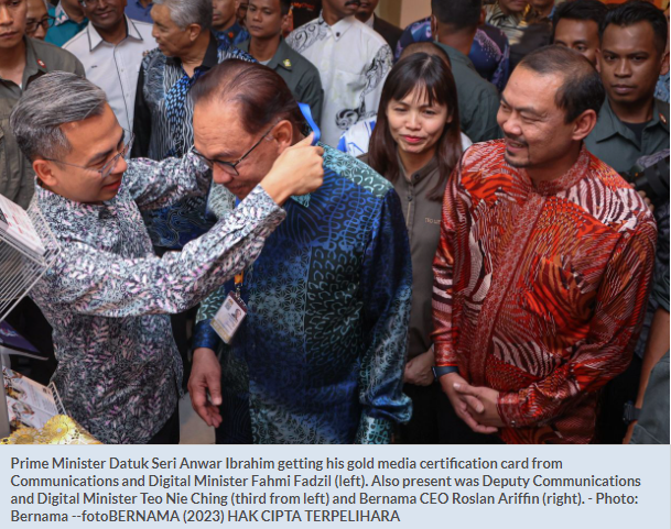 Communications and Digital Minister Fahmi Fadzil presented the media card to the prime minister in appreciation of his efforts to raise the dignity of continued media freedom in Malaysia.