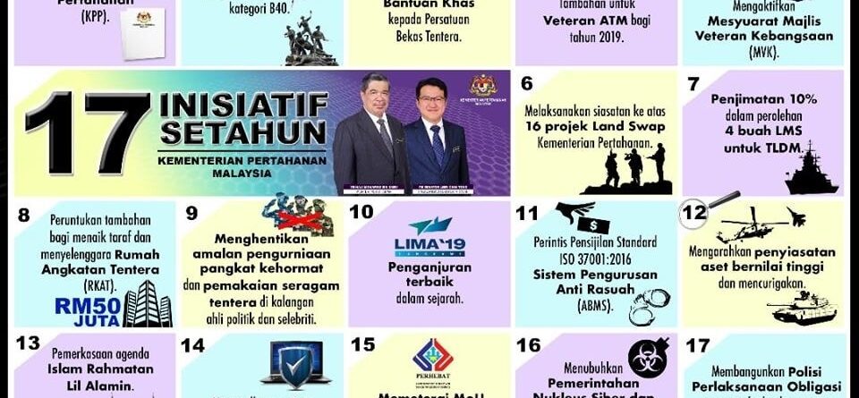 Kementerian Pertahanan komited untuk terus melaksanakan pelbagai usaha dan inisiatif bagi memastikan kesiagaan ATM sentiasa berada di tahap terbaik dalam menjaga keselamatan dan kedaulatan negara. Pada masa yang sama memastikan kebajikan warga kementerian, veteran dan anggota ATM terjaga dan terbela.[/vc_column_text][/vc_column][/vc_row]