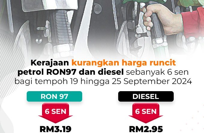 KERAJAAN KURANGKAN HARGA RUNCIT PETROL RON97 DAN DIESEL SEBANYAK 6 SEN BAGI TEMPOH 19 HINGGA 25 SEPTEMBER 2024