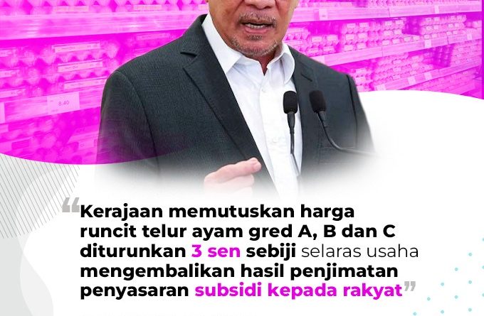 KERAJAAN MEMUTUSKAN HARGA RUNCIT TELUR AYAM GRED A, B DAN C DITURUNKAN 3 SEN SEBIJI SELARAS USAHA MENGEMBALIKAN HASIL PENJIMATAN PENYASARAN SUBSIDI KEPADA RAKYAT
