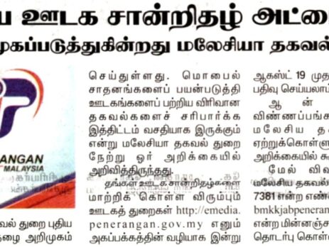 TAMIL MALAR | 19.8.2020 (RABU) | M/S : | DEPARTMENT OF INFORMATION MALAYSIA INTRODUCES NEW MEDIA ACCREDITATION CARD