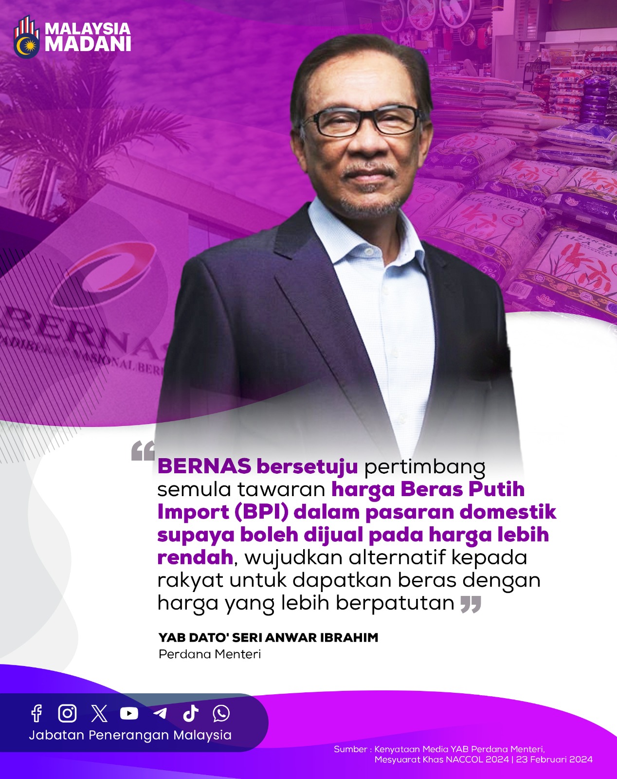 BERNAS BERSETUJU PERTIMBANG SEMULA TAWARAN HARGA BERAS PUTIH IMPORT (BPI) DALAM PASARAN DOMESTIK SUPAYA BOLEH DIJUAL PADA HARGA LEBIH RENDAH, WUJUDKAN ALTERNATIF KEPADA RAKYAT