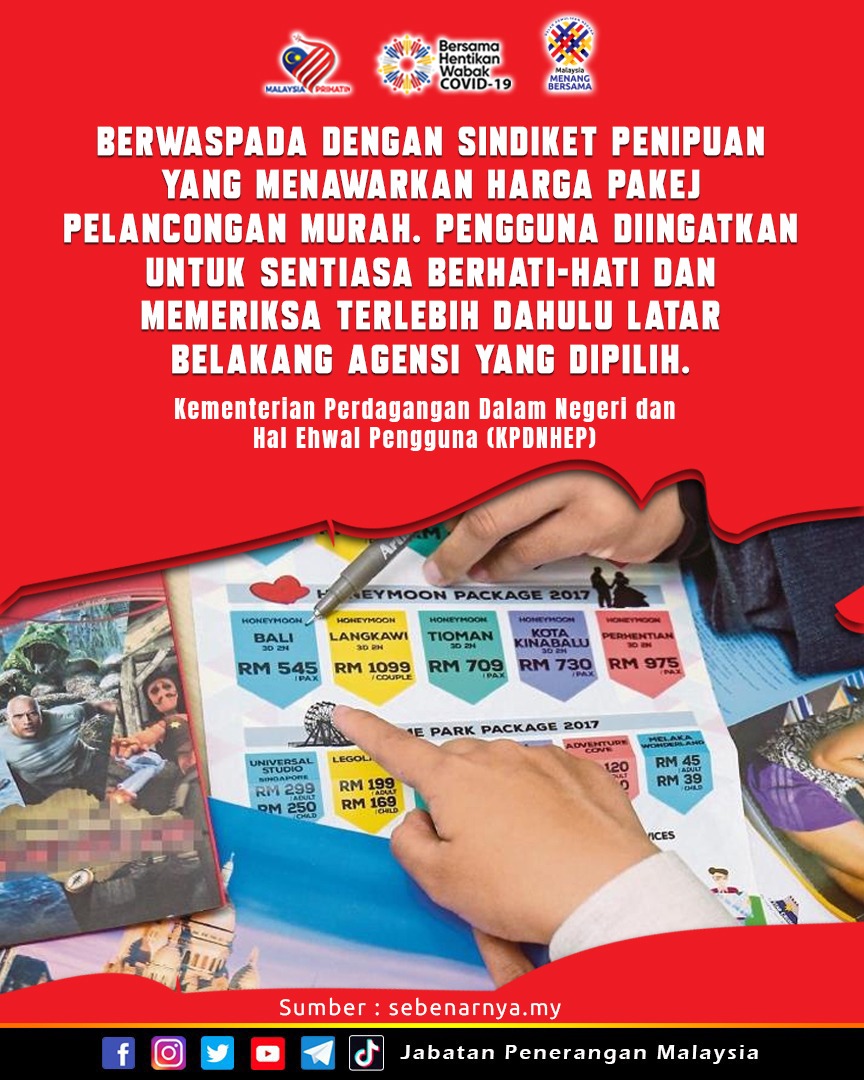 BEWASPADA DENGAN SINDIKET PENIPUAN YANG MENAWARKAN HARGA PAKEJ PELANCONGAN MURAH. PENGGUNA DIINGATKAN UNTUK SENTIASA BERHATI-HATI DAN MEMERIKSA TERLEBIH DAHULU LATAR BELAKANG AGENSI YANG DIPILIH