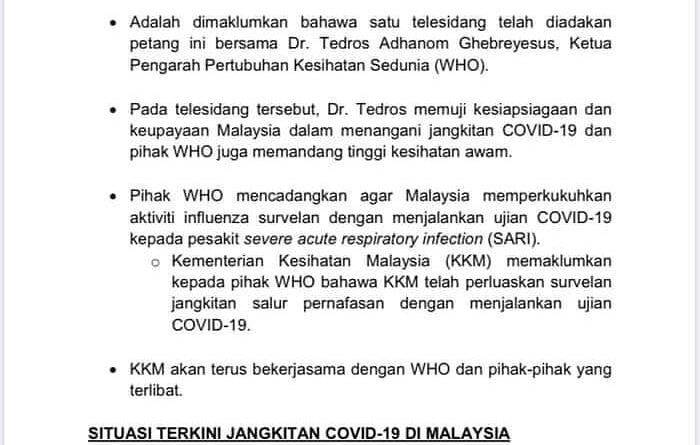 Ketua Pengarah Perubatan Kesihatan Sedunia, Dr. Tedros Adhanom Ghebreyesus puji kesiapsiagaan dan keupayaan Malaysia menangani wabak COVID-19 dan mencadangkan Malaysia memperkukuhkan aktiviti Influenza survelan dengan menjalankan ujian COVID-19 kepada pesakit severe acute resporitary infection (SARI) dan Malaysia telahpun mengambil tindakan saranan tersebut.