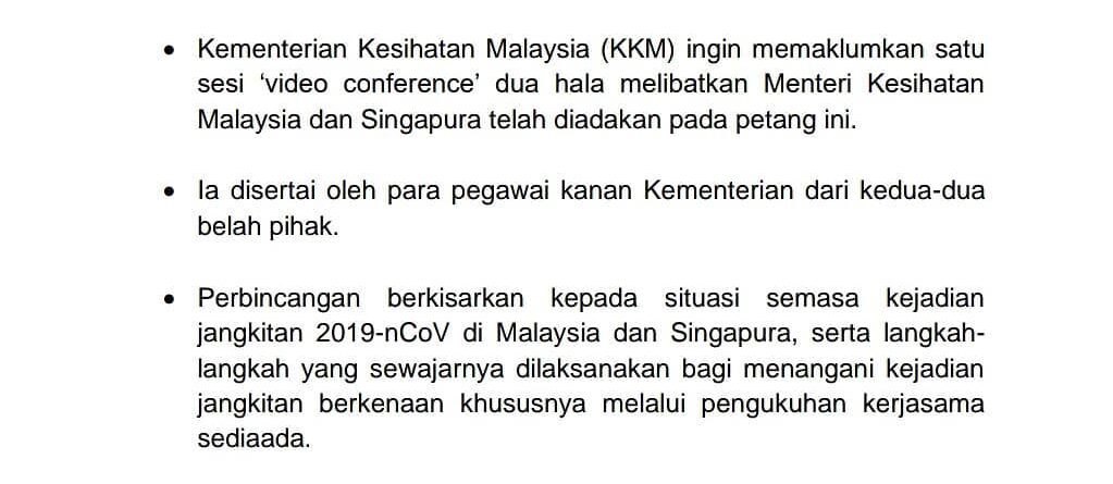 "Beliau seterusnya telah dirujuk dengan segera ke Hospital Sungai Buloh. Pihak hospital sudah pun memulakan rawatan dan menjalankan siasatan lanjut. Sampel klinikal pesakit telah diambil dan pada 9 Feb telah disahkan positif 2019-nCoV," katanya.