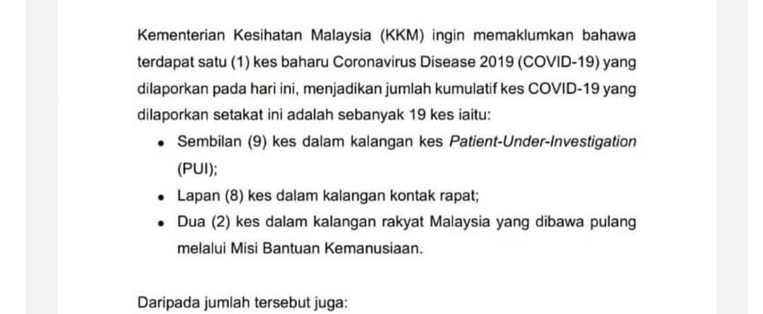 Ia membabitkan tujuh kes dalam kalangan pesakit dalam siasatan (PUI) jangkitan, lapan kes dalam kalangan kontak rapat dan dua kes dalam kalangan rakyat Malaysia yang dibawa pulang dengan Misi Bantuan Kemanusiaan.
