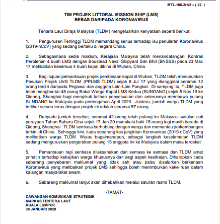 "Kandungan mengenai wabak Novel Coronavirus (2019-nCov) itu didapati palsu," katanya.