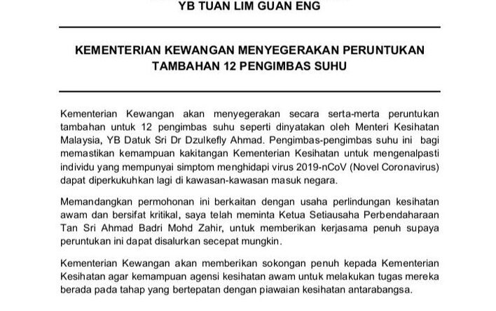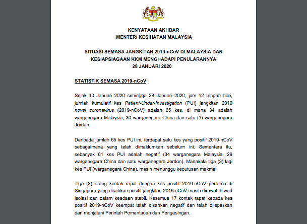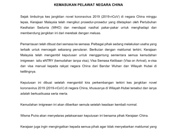 jonathan2020-01-27T08:30:09+08:00[vc_row][vc_column][vc_empty_space][vc_single_image image="3108" img_size="full" alignment="center"][vc_column_text]27 Jan-TERKINI: Kerajaan telah mengambil keputusan untuk menggantung sementara semua kemudahan imigresen iaitu eNTRY (kemudahan tanpa visa),Visa Semasa Ketibaan (Visa on Arrival),e-visa dan visa manual kepada rakyat negara China dari Bandar Wuhan dan Wilayah Hubei di kelilingnya.[/vc_column_text][/vc_column][/vc_row]