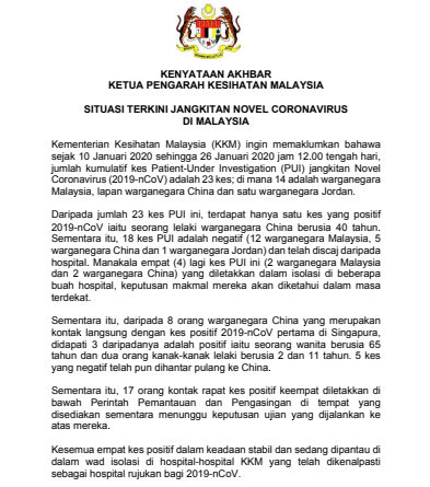 Sehingga kini, Kementerian Kesihatan mengesahkan terdapat empat kes disahkan positif Koronavirus.