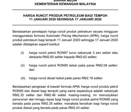 HARGA PETROL RON97 TURUN TIGA SEN KEPADA RM2.62 SELITER, RON95 DAN DIESEL KEKAL – KEMENTERIAN KEWANGAN