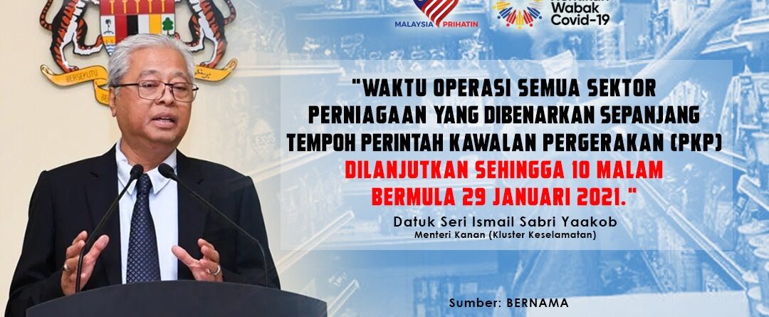 WAKTU OPERASI SEMUA SEKTOR PERNIAGAAN YANG DIBENARKAN SEPANJANG TEMPOH PKP DILANJUTKAN SEHINGGA 10 MALAM BERMULA 29 JANUARI 2021