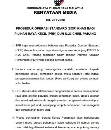 PROSEDUR OPERASI STANDARD (SOP) KHAS PILIHAN RAYA KECIL (PRK) DUN N.23 CHINI, PAHANG