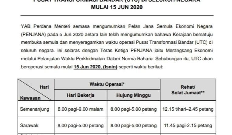 PEMBUKAAN SEMULA PENGOPERASIAN PUSAT TRANSFORMASI BANDAR (UTC) DI SELURUH NEGARA MULAI 15 JUN 2020