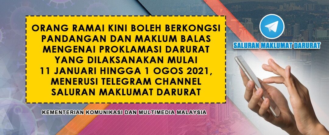 ORANG RAMAI KINI BOLEH BERKONGSI PANDANGAN DAN MAKLUM BALAS MENGENAI PROKLAMASI DARURAT YANG DILAKSANAKAN MULAI 11 JANUARI HINGGA 1 OGOS 2021 MENERUSI TELEGRAM CHANNEL SALURAN MAKLUMAT DARURAT