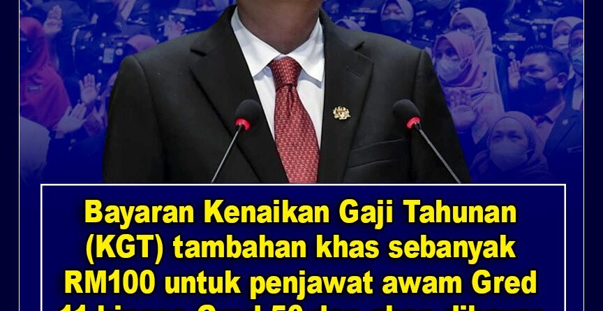 BAYARAN KGT TAMBAHAN KHAS SEBANYAK RM100 UNTUK PENJAWAT AWAM GRED 11 HINGGA GRED 56 DAN AKAN DIBAYAR MULAI JANUARI 2023