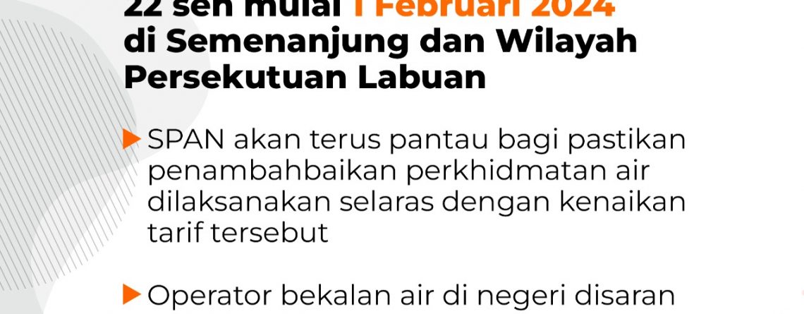 PELARASAN TARIF AIR DOMESTIK LIBATKAN KENAIKAN PURATA 22 SEN MULAI 1 FEBRUARI 2024 DI SEMENANJUNG DAN WILAYAH PERSEKUTUAN LABUAN