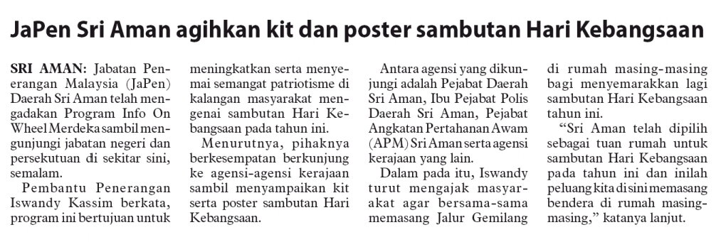 jonathan2023-10-27T18:34:50+08:00UTUSAN BORNEO SARAWAK | 20.8.2020 (KHAMIS) | M/S : | JAPEN SRI AMAN AGIHKAN KIT DAN POSTER SAMBUTAN HARI KEBANGSAAN