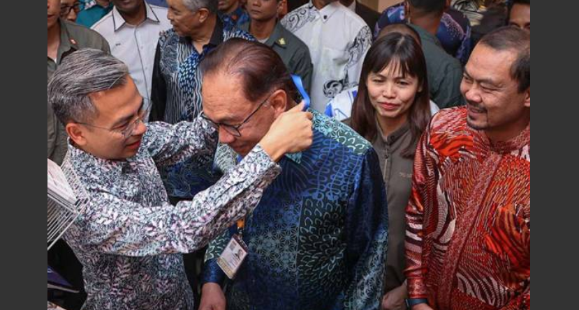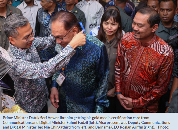 Communications and Digital Minister Fahmi Fadzil presented the media card to the prime minister in appreciation of his efforts to raise the dignity of continued media freedom in Malaysia.