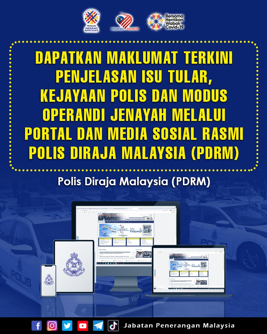 DAPATKAN MAKLUMAT TERKINI PENJELASAN ISU TULAR KEJAYAAN POLIS DAN MODUS OPERANDI JENAYAH MELALUI PORTAL DAN MEDIA SOSIAL RASMI POLIS DIRAJA MALAYSIA (PDRM)