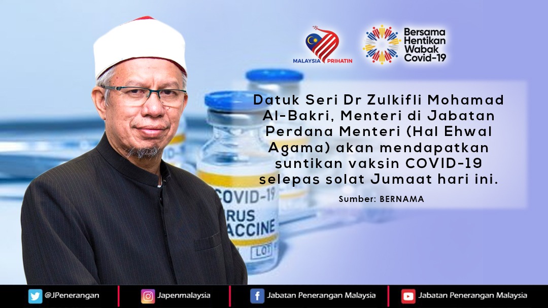 DATUK SERI DR ZULKIFLI MOHAMAD AL-BAKRI, MENTERI DI JABATAN PERDANA MENTERI (HAL EHWAL AGAMA) AKAN MENDAPATKAN SUNTIKAN VAKSIN COVIS-19 SELEPAS SOLAT JUMAAT HARI INI