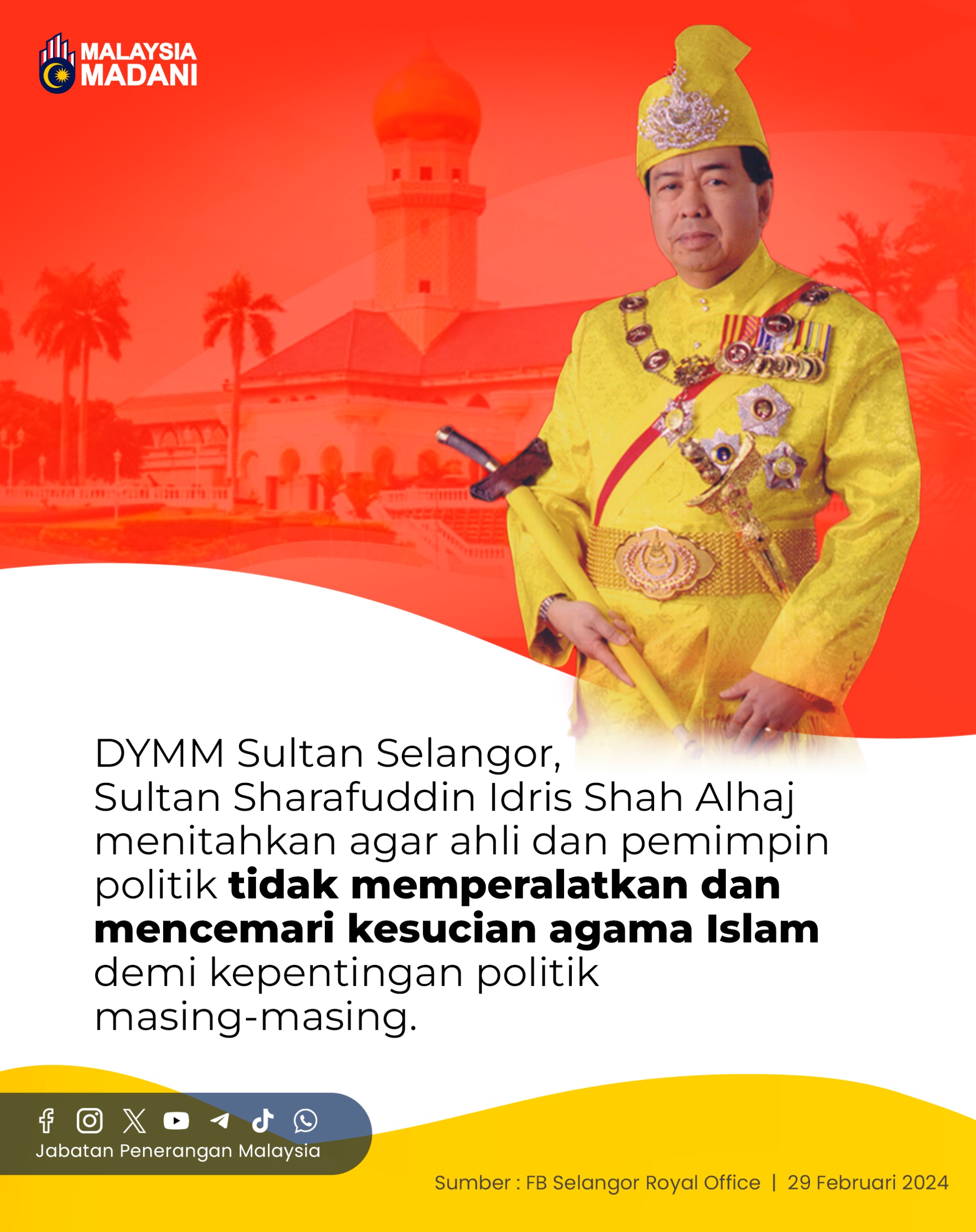 DYMM SULTAN SELANGOR, SULTAN SHARAFUDDIN IDRIS SHAH ALHAJ MENITAHKAN AGAR AHLI DAN PEMIMPIN POLITIK TIDAK MEMPERALATKAN DAN MENCEMARI KESUCIAN AGAMA ISLAM DEMI KEPENTINGAN POLITIK MASING-MASING