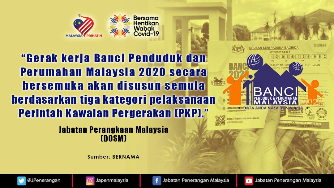 GERAK KERJA BANCI PENDUDUK DAN PERUMAHAN MALAYSIA 2020 SECARA BERSEMUKA AKAN DISUSUN SEMULA BERDASARKAN TIGA KATEGORI PELAKSANAAN PERINTAH KAWALAN PERGERAKAN (PKP)
