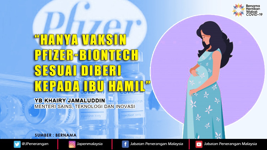 HANYA VAKSIN JENIS PFIZER-BIONTECH SESUAI DIBERIKAN KEPADA IBU YANG HAMIL DENGAN TEMPOH KANDUNGAN BERUSIA 14 HINGGA 33 MINGGU, KATA MENTERI PENYELARAS PROGRAM IMUNISASI COVID-19 KEBANGSAAN, KHAIRY JAMALUDDIN ABU BAKAR.