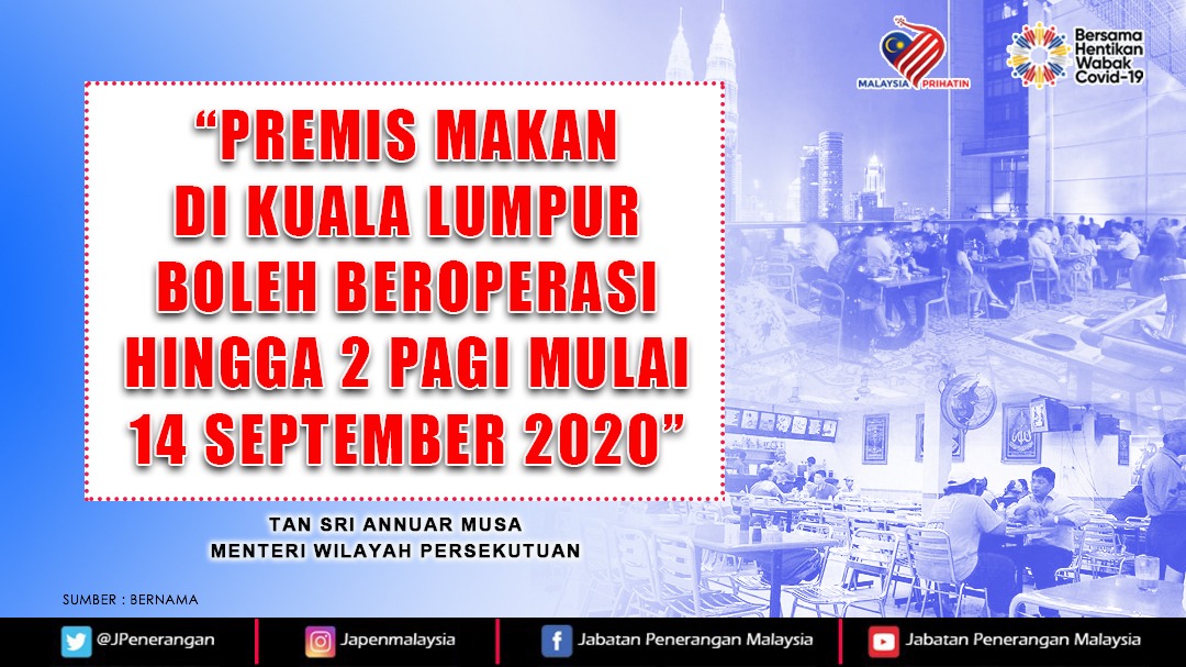 “PREMIS MAKAN DI KUALA LUMPUR BOLEH BEROPERASI HINGGA 2 PAGI MULAI 14 SEPTEMBER 2020”