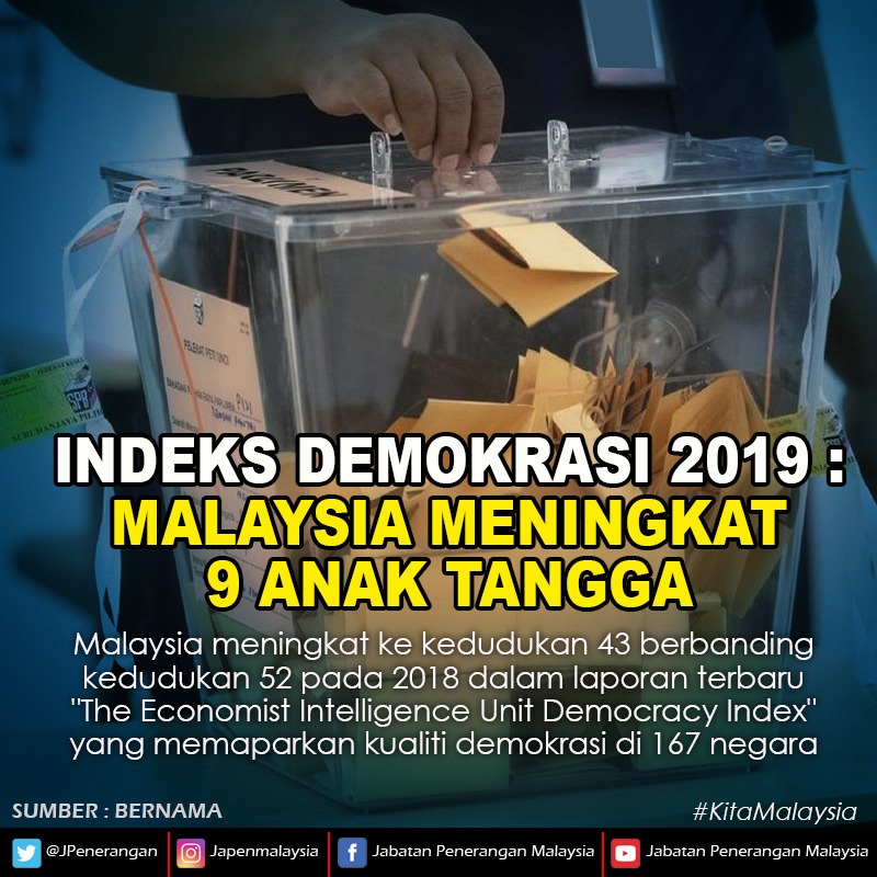 INDEKS DEMOKRASI 2019 : MALAYSIA MENINGKAT 9 ANAK TANGGA
