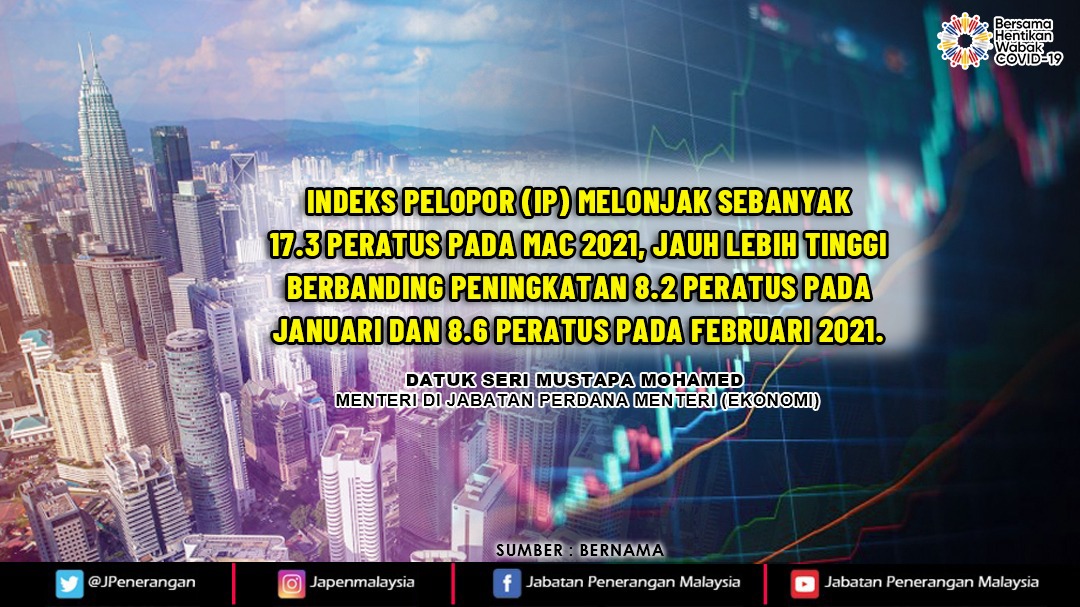 INDEKS PELOPOR (IP) MELONJAK SEBANYAK 17.3 PERATUS PADA MAC 2021, INI ADALAH INDIKATOR YANG MEMBERI GAMBARAN TENTANG PROSPEK EKONOMI NEGARA BAGI EMPAT HINGGA ENAM BULAN KE HADAPAN.