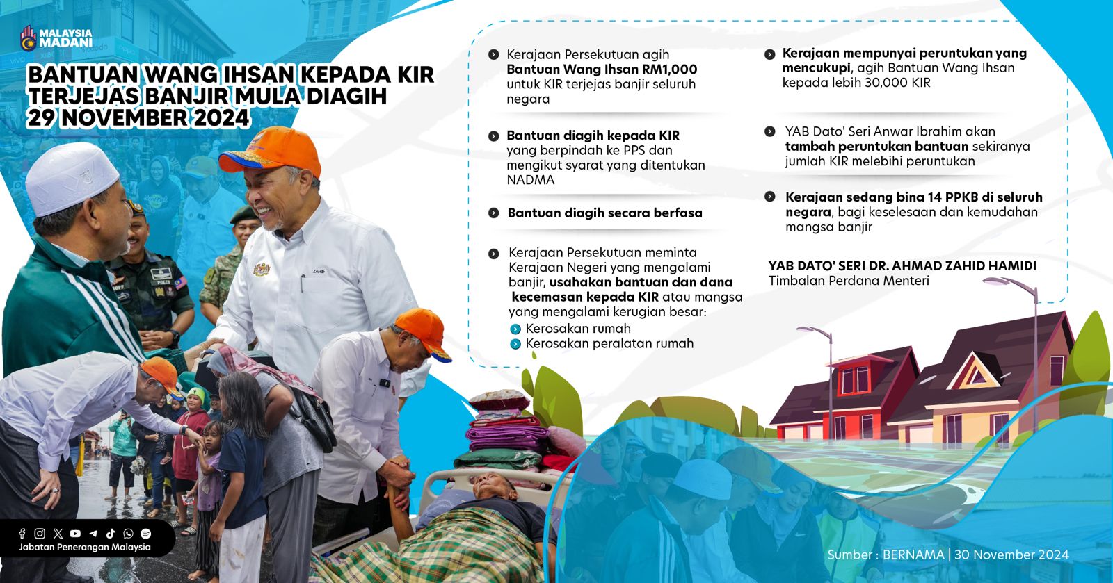 KERAJAAN PERSEKUTUAN AGIH BANTUAN WANG IHSAN RM1,000 UNTUK KETUA ISI RUMAH YANG TERJEJAS AKIBAT BANJIR DI SELURUH NEGARA BERMULA SEMALAM
