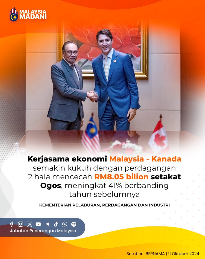 KERJASAMA EKONOMI MALAYSIA – KANADA SEMAKIN KUKUH DENGAN PERDAGANGAN 2 HALA MENCECAH RM8.05 BILION SETAKAT OGOS, MENINGKAT 41% BERBANDING TAHUN SEBELUMNYA