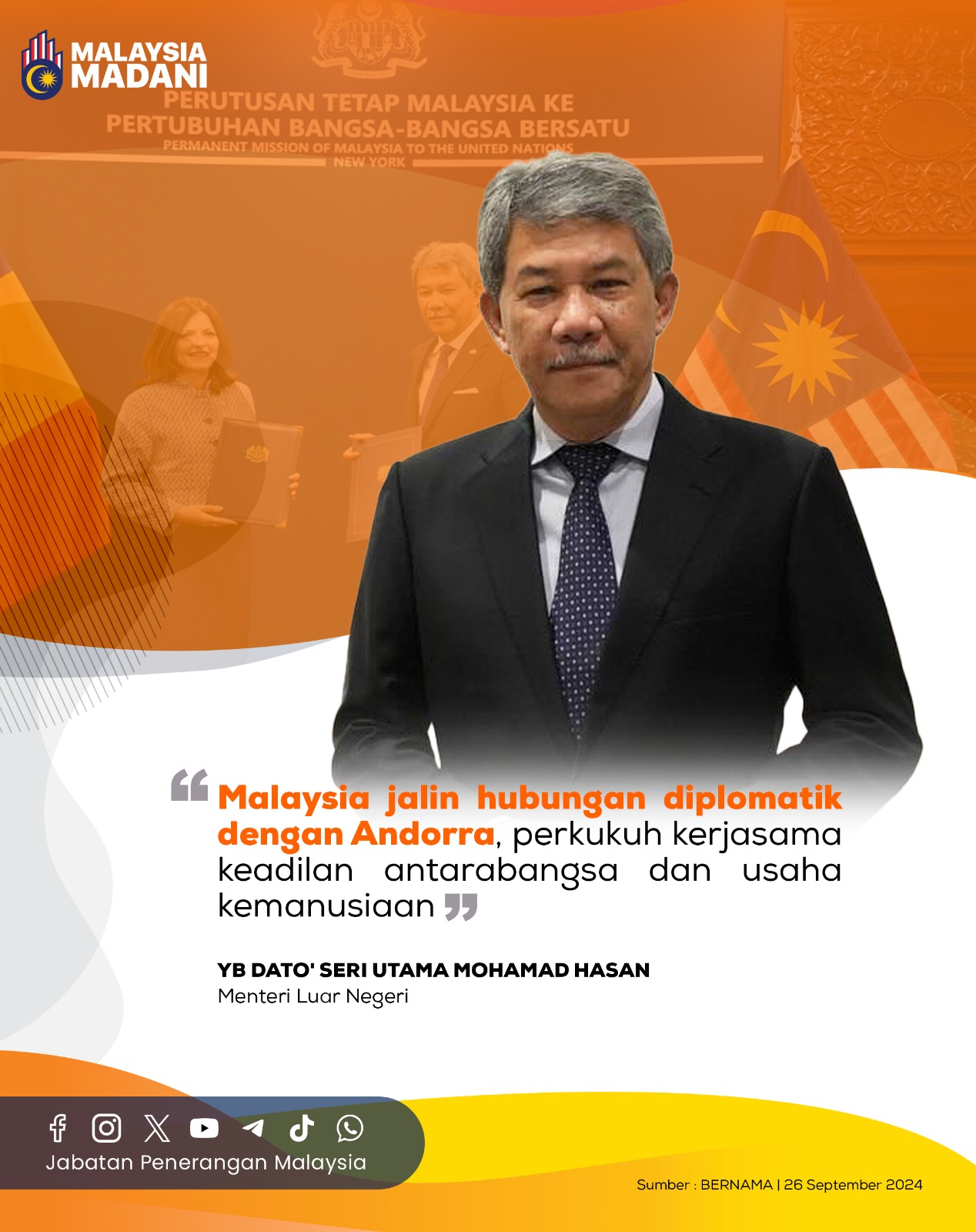 MALAYSIA JALIN HUBUNGAN DIPLOMATIK DENGAN ANDORRA, PERKUKUH KERJASAMA KEADILAN ANTARABANGSA DAN USAHA KEMANUSIAAN