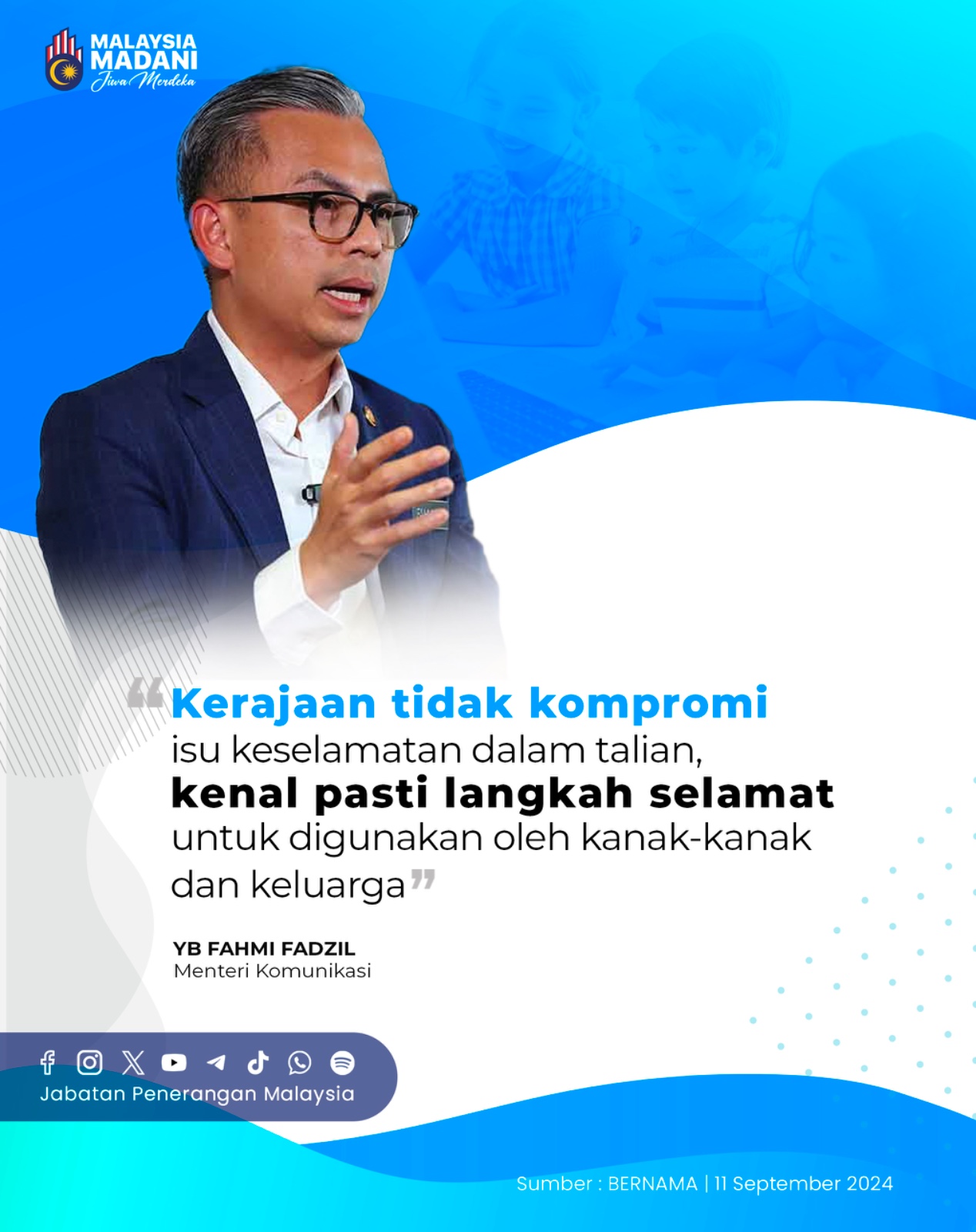 KERAJAAN TIDAK KOMPROMI ISU KESELAMATAN DALAM TALIAN, KENAL PASTI LANGKAH SELAMAT UNTUK DIGUNAKAN OLEH KANAK-KANAK DAN KELUARGA