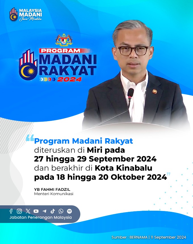PROGRAM MADANI RAKYAT DITERUSKAN DI MIRI PADA 27 HINGGA 29 SEPTEMBER 2024 DAN BERAKHIR DI KOTA KINABALU PADA 18 HINGGA 20 OKTOBER 2024