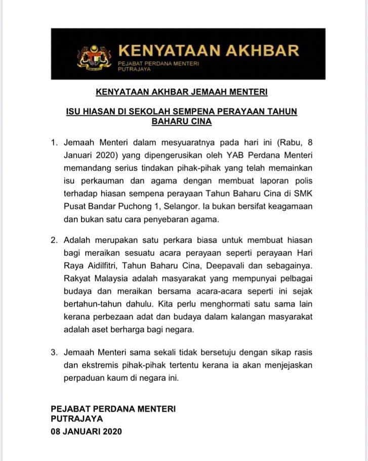 KENYATAAN AKHBAR JEMAAH MENTERI : ISU HIASAN DI SEKOLAH SEMPENA PERAYAAN TAHUN BAHARU CINA
