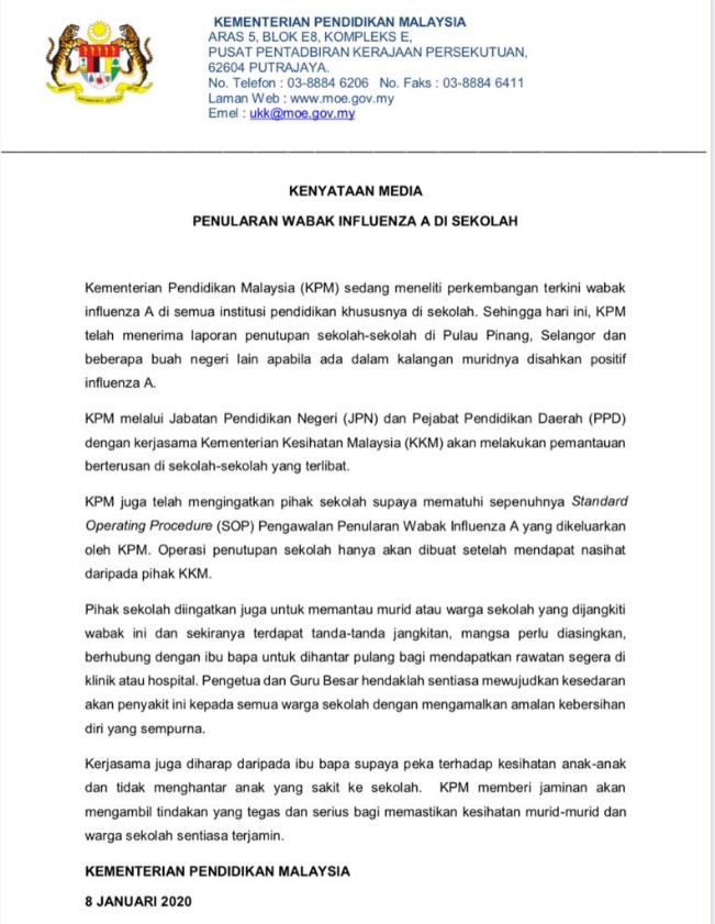 KENYATAAN MEDIA PENULARAN WABAK INFLUENZA A DI SEKOLAH