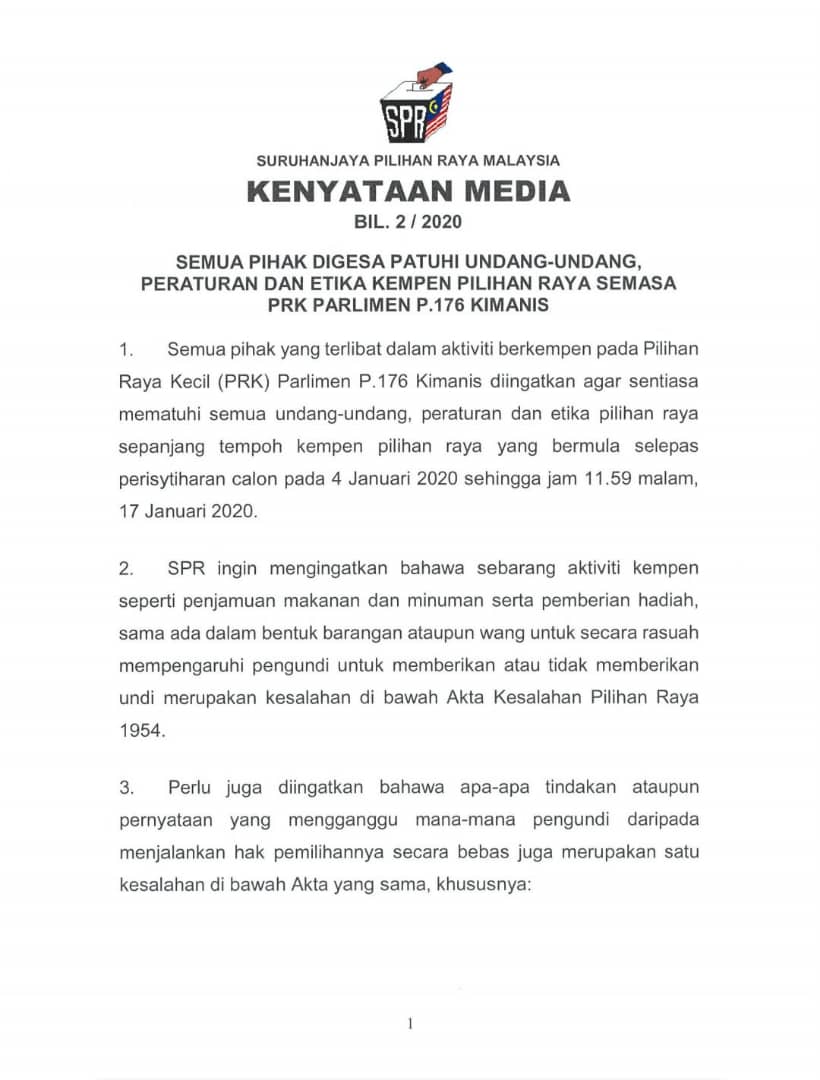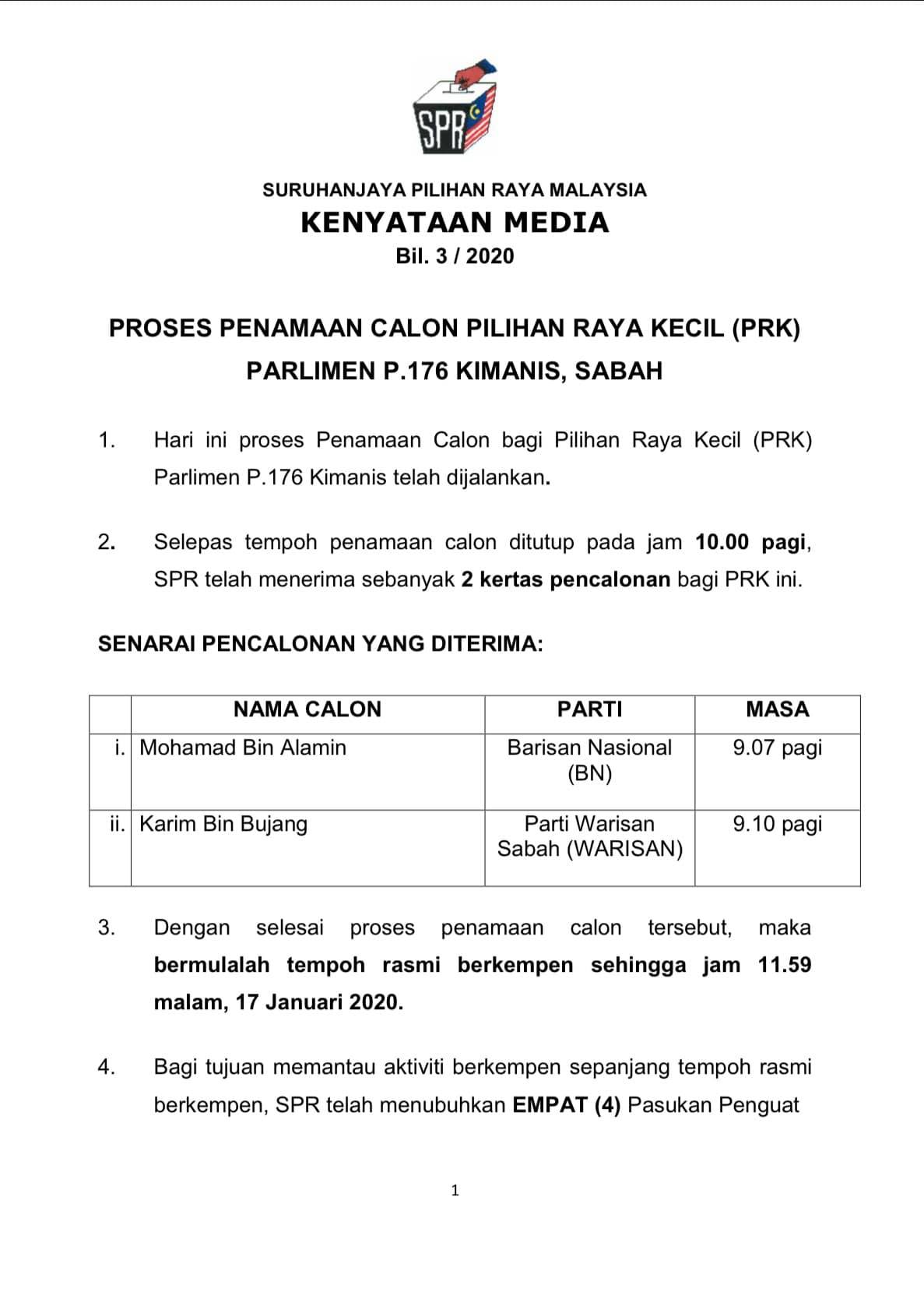 PEMAKLUMAN HARI PENAMAAN CALON PILIHAN RAYA KECIL (PRK) PARLIMEN P. 176 KIMANIS, SABAH