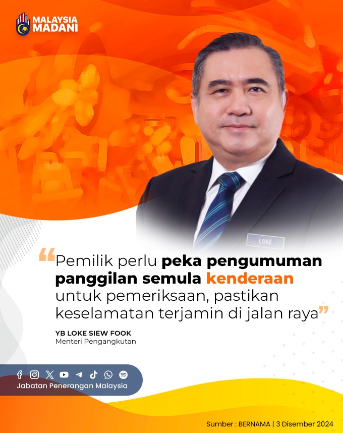 PEMILIK PERLU PEKA PENGUMUMAN PANGGILAN SEMULA KENDERAAN UNTUK PEMERIKSAAN, PASTIKAN KESELAMATAN TERJAMIN DI JALAN RAYA