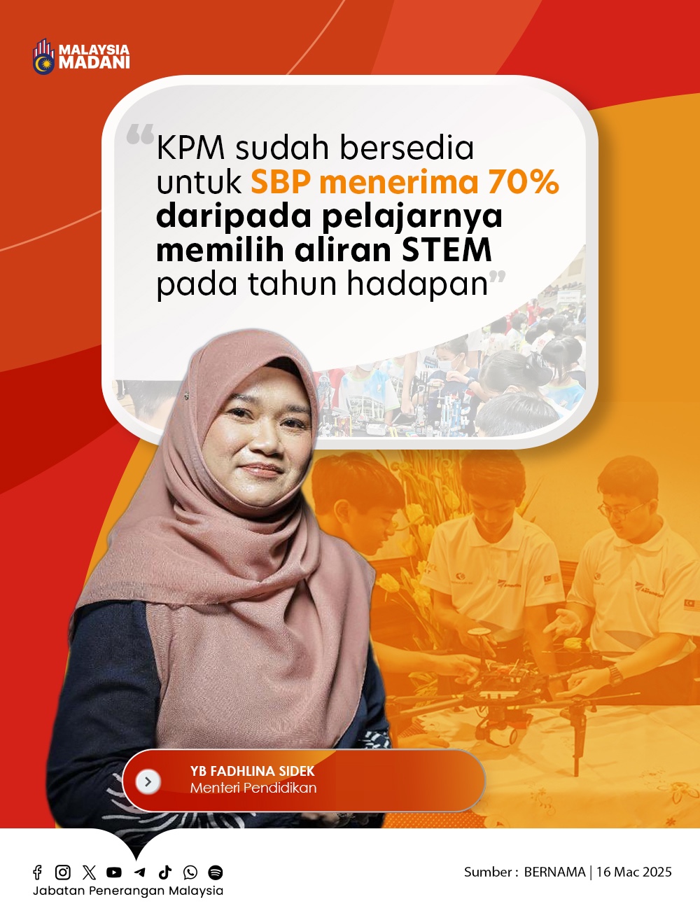 KPM SUDAH BERSEDIA UNTUK SBP MENERIMA 70% DARIPADA PELAJARNYA MEMILIH ALIRAN STEM PADA TAHUN HADAPAN
