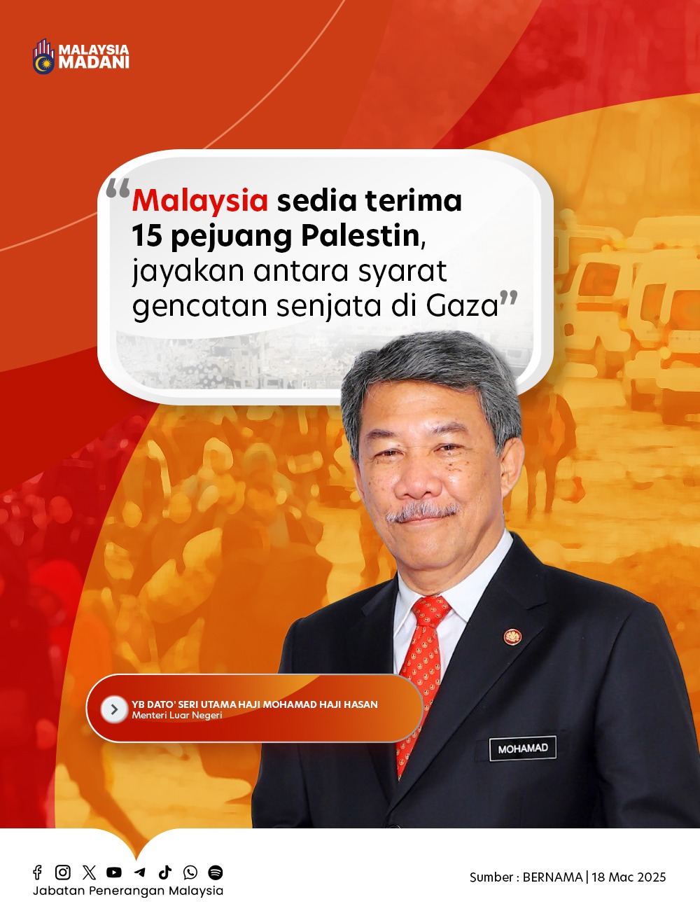 MALAYSIA SEDIA TERIMA 15 PEJUANG PALESTIN, JAYAKAN ANTARA SYARAT GENCATAN SENJATA DI GAZA