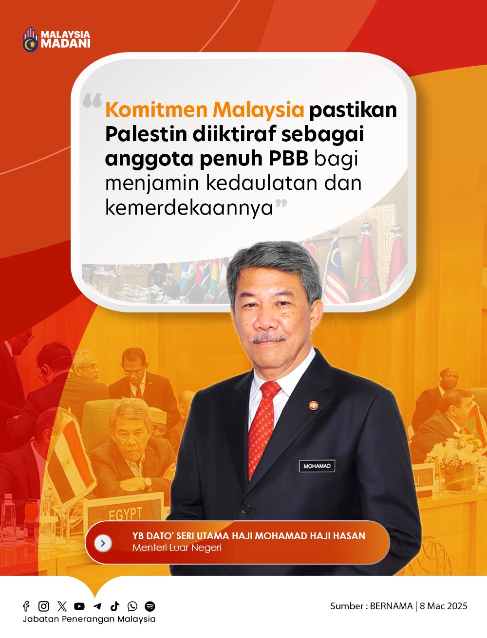 KOMITMEN MALAYSIA PASTIKAN PALESTIN DIIKTIRAF SEBAGAI ANGGOTA PENUH PBB BAGI MENJAMIN KEDAULATAN DAN KEMERDEKAANNYA