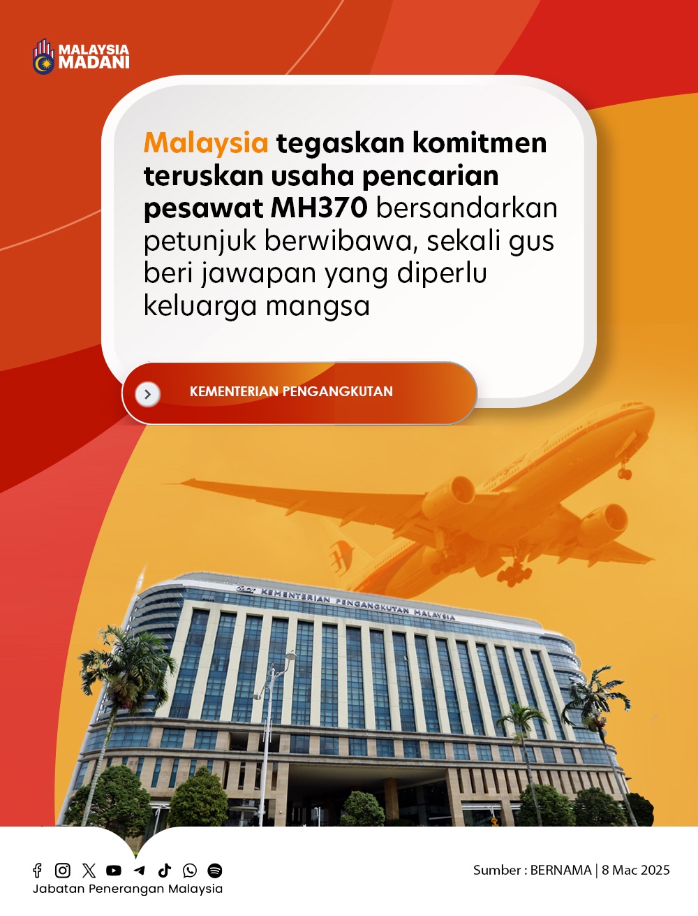 MALAYSIA TEGASKAN KOMITMEN TERUSKAN USAHA PENCARIAN PESAWAT MH370 BERSANDARKAN PETUNJUK BERWIBAWA, SEKALI GUS BERI JAWAPAN YANG DIPERLU KELUARGA MANGSA