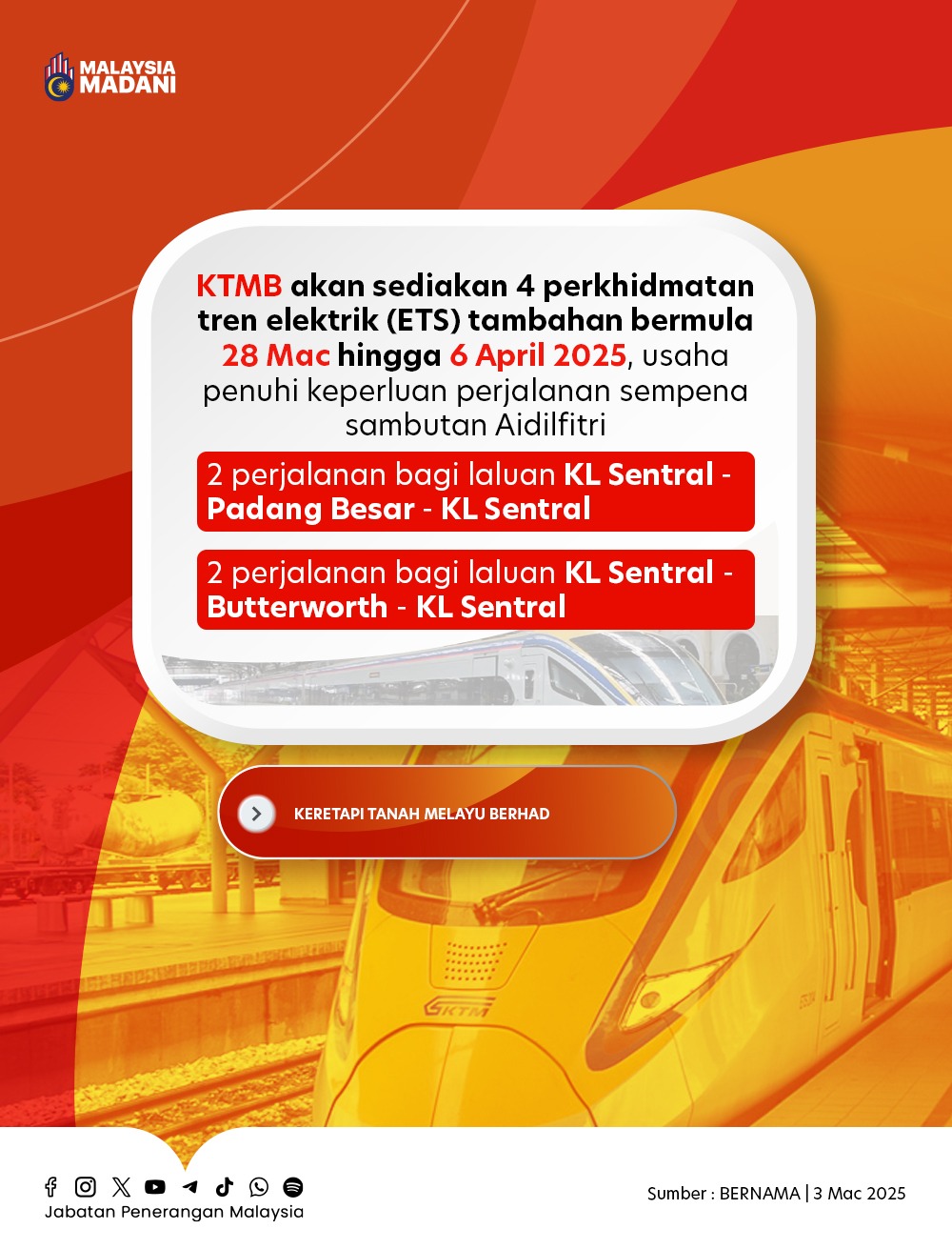 KTMB AKAN SEDIAKAN 4 PERKHIDMATAN TREN ELEKTRIK (ETS) TAMBAHAN BERMULA 28 MAC HINGGA 6 APRIL 2025, USAHA PENUHI KEPERLUAN PERJALANAN SEMPENA SAMBUTAN AIDILFITRI