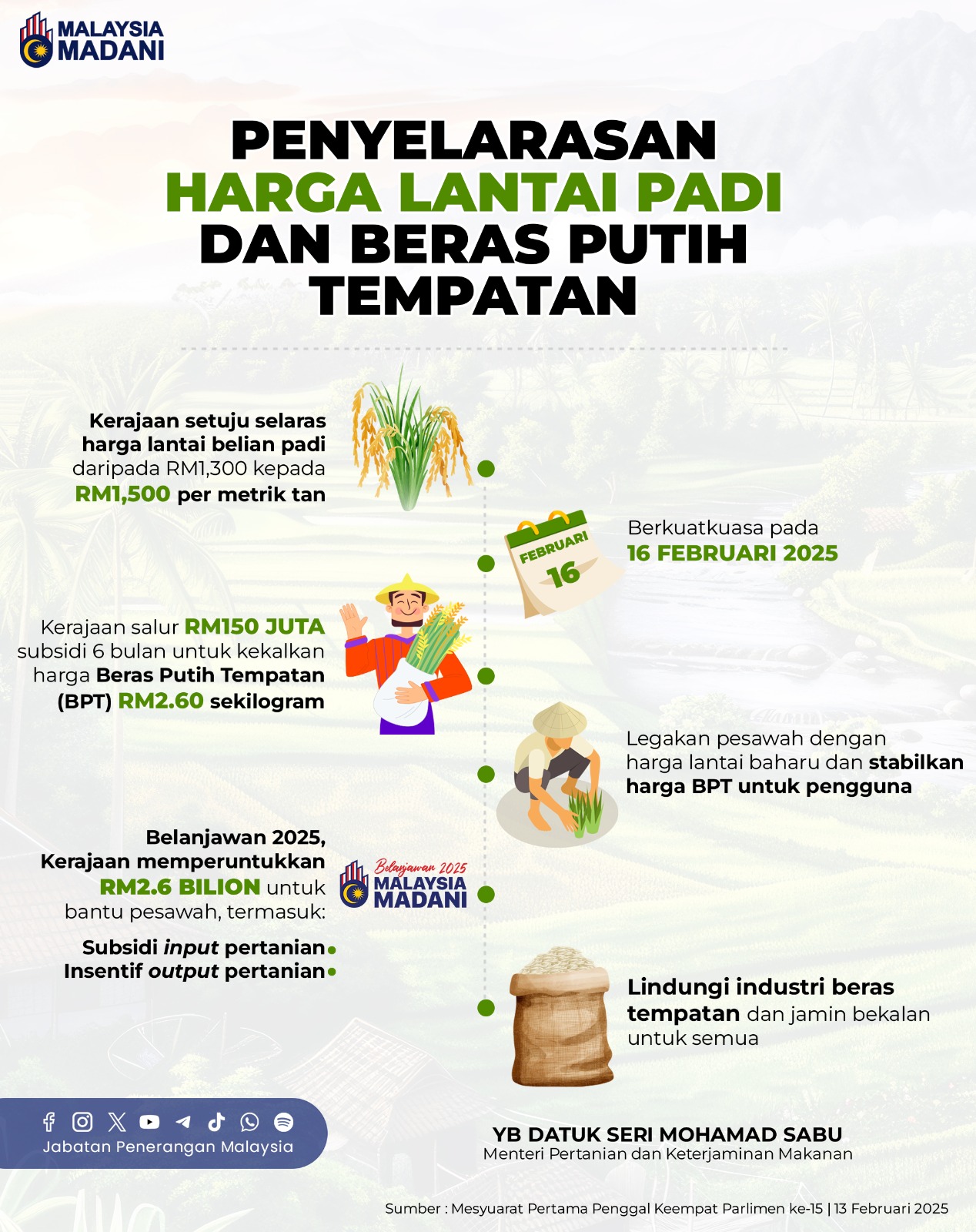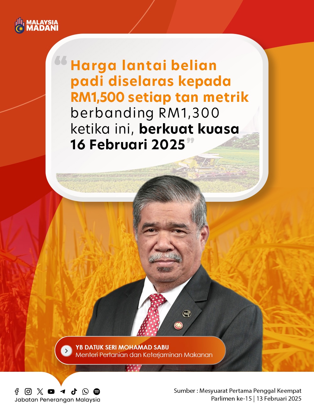 HARGA LANTAI BELIAN PADI DISELARAS KEPADA RM1,500 SETIAP TAN METRIK BERBANDING RM1,300 KETIKA INI, BERKUAT KUASA 16 FEBRUARI 2025