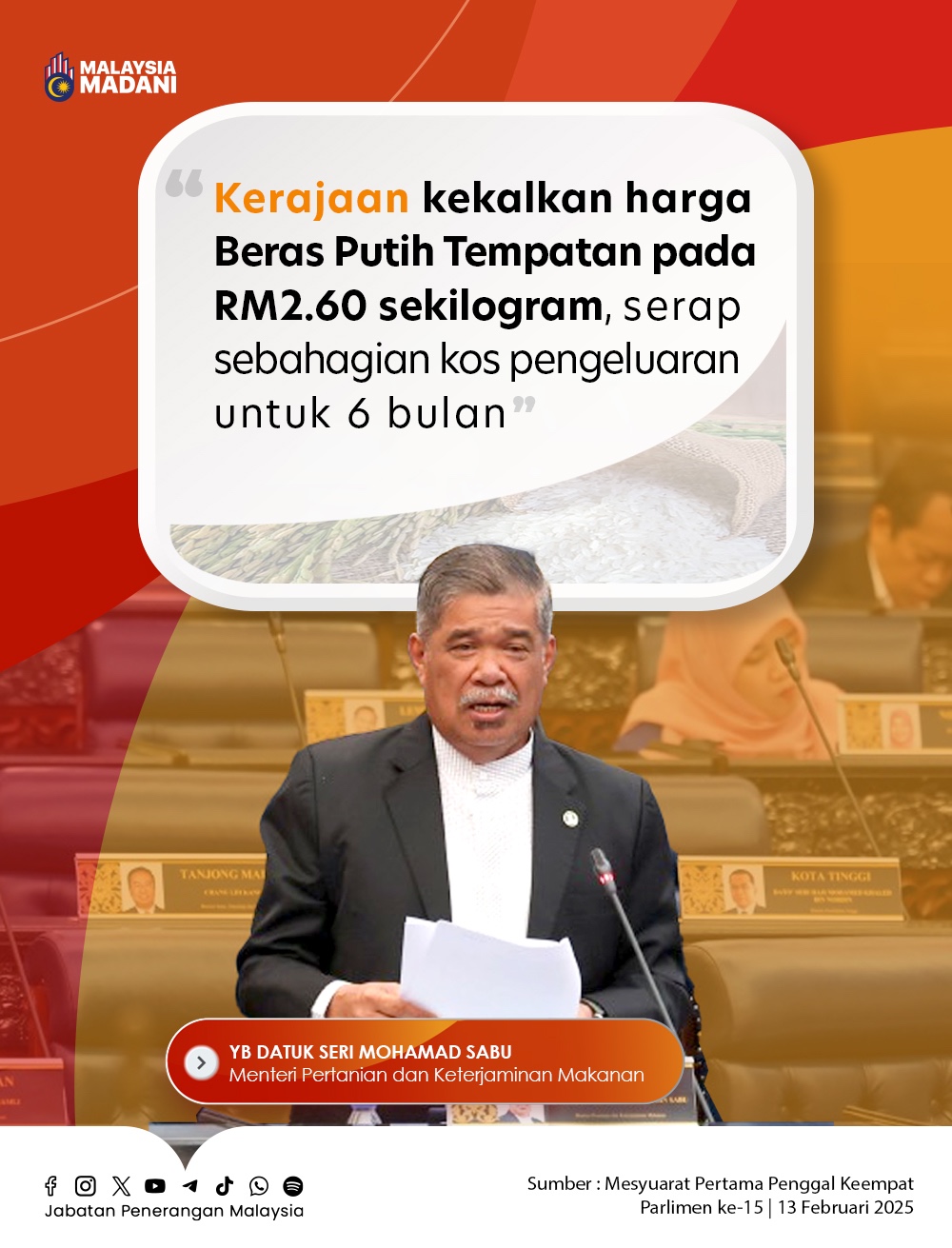 KERAJAAN KEKALKAN HARGA BERAS PUTIH TEMPATAN PADA RM2.60 SEKILOGRAM, SERAP SEBAHAGIAN KOS PENGELUARAN UNTUK 6 BULAN